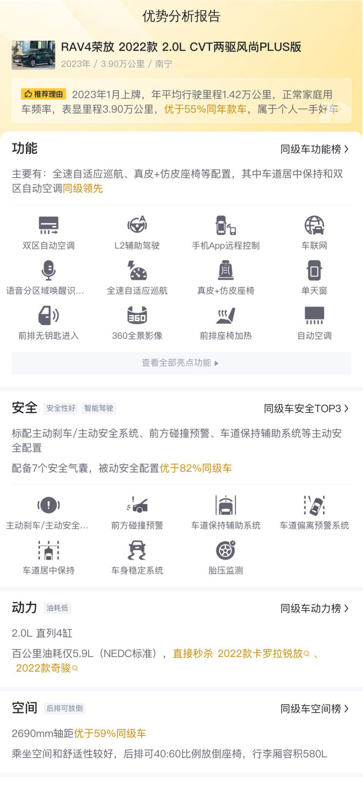 这辆RAV4荣放 2022款 2.0L CVT两驱风尚PLUS版配置丰富,经常用车的全速自适应巡航、无钥匙进入、车道居中保持都有配备,基本能满足日常使用所需;并且这辆RAV4荣放 2022款 2.0L CVT两驱风尚PLUS版还拥有较高的保值率和较低的用车成本,经济性方面表现良好。
